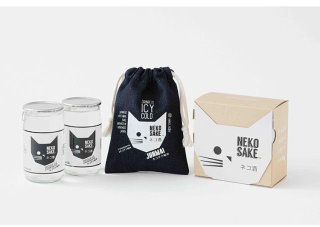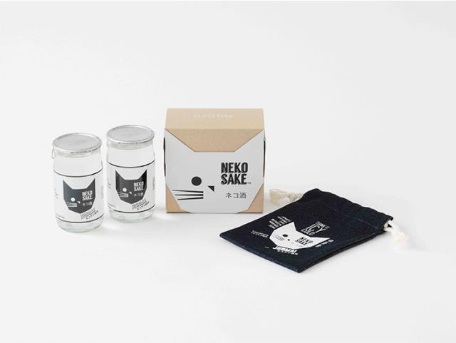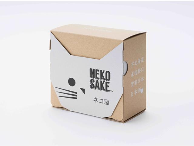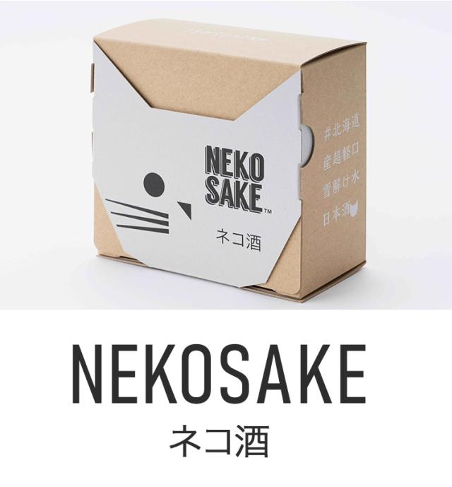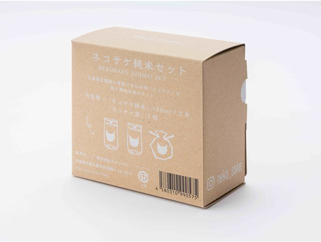 北海道産超軽口雪解け水日本酒ブランド、ネコサケの第三弾商品「ネコサケ純米」2本とネコサケ巾着袋1枚がコンパクトに、ネコ箱に収まってそのままプレゼントできるセットです。