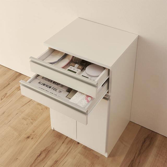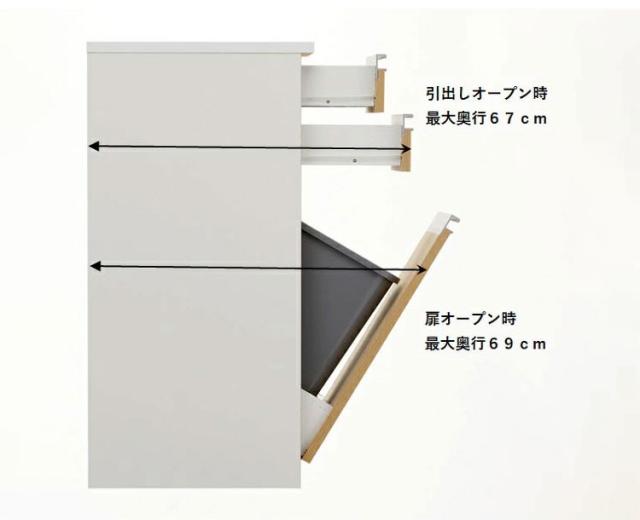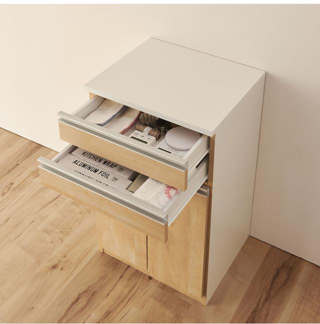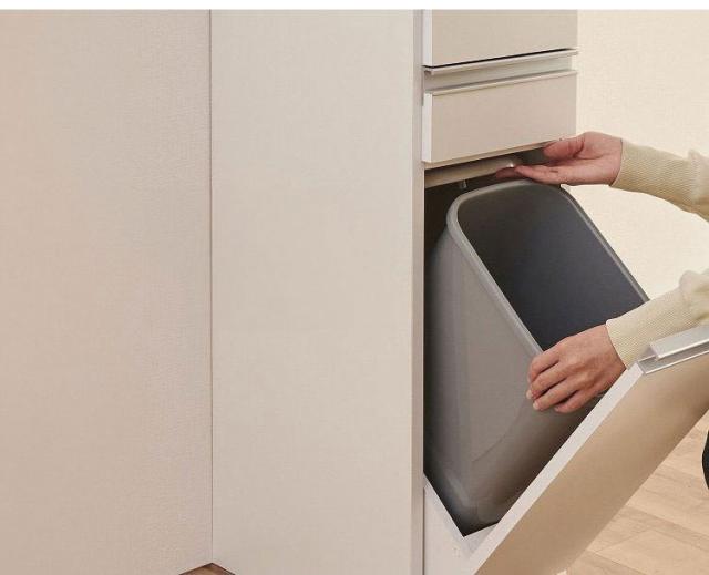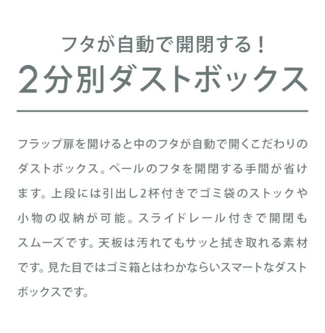 フラップ扉を開けると中のフタが自動で開くこだわりのダストボックス。ペールのフタを開閉する手間が省けます。上段には引出し2杯付きでゴミ袋のストックや小物の収納が可能。スライドレール付きで開閉もスムーズです。天板は汚れてもサッと拭き取れる素材です。メープル柄のナチュラルとホワイトの組合せがおしゃれでどんなシーンにもマッチします。見た目ではゴミ箱とはわかならいスマートな家具調のダストボックスです。