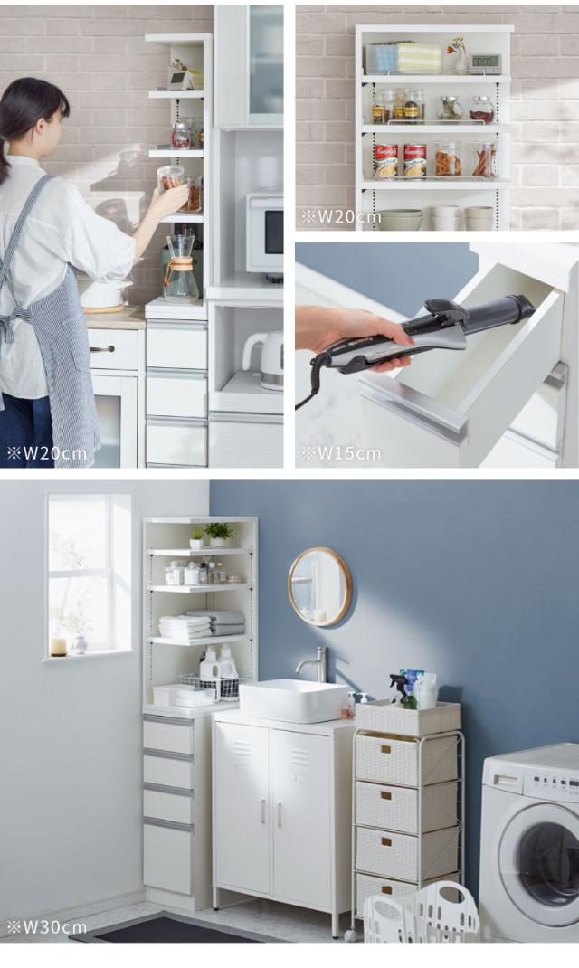 幅15cm/オープン+引き出し収納 | 幅20cm/オープン+引き出し収納 | 幅25cm/オープン+引き出し収納 | 幅30cm/オープン+引き出し収納 |