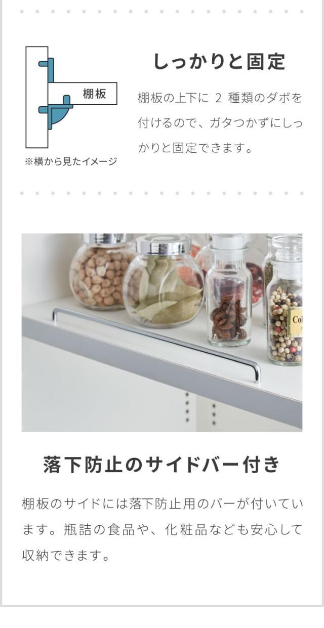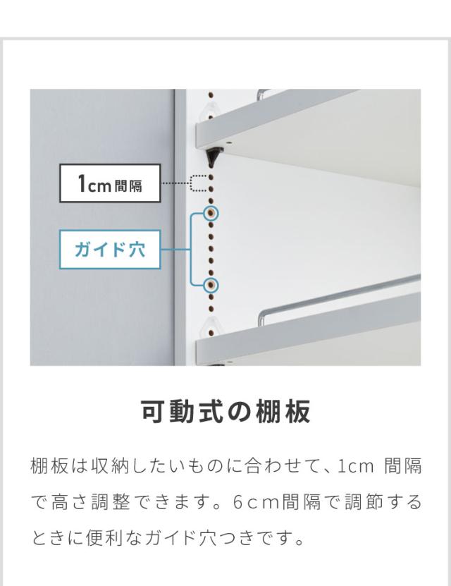 1cmピッチ(6cm間隔でガイド穴つき)で可動棚が調節可能。