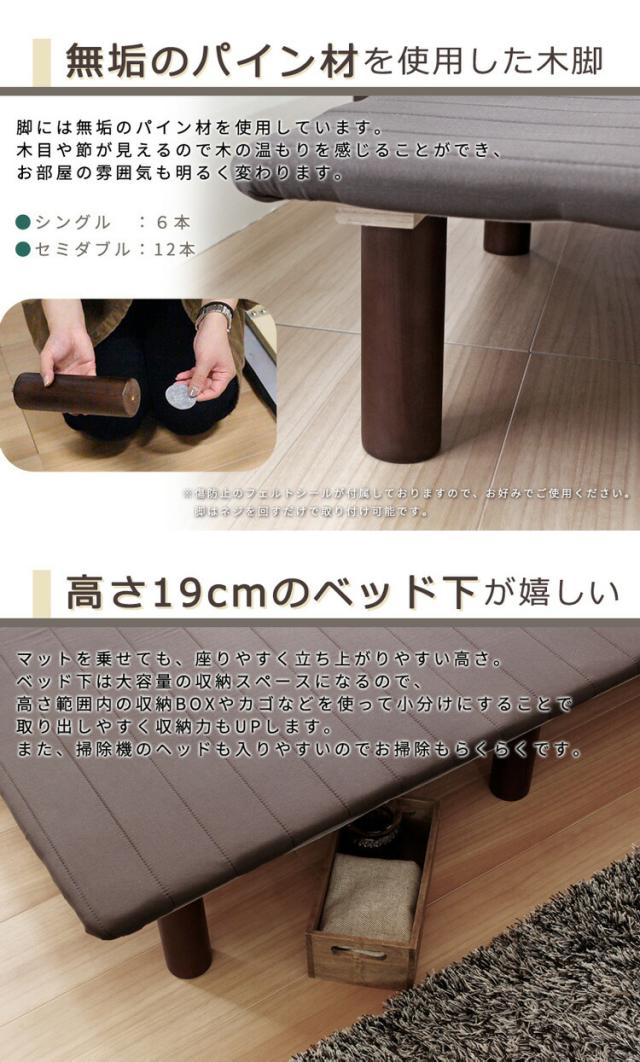 収納スペースにもなる高さ19cmの木脚は無垢のパイン材を使用しております。