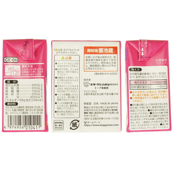 ・乳糖ゼロ、お腹にやさしい愛猫用の牛乳。1歳までの成長期用。ラクトフェリン配合。九州産生乳使用。国産。
