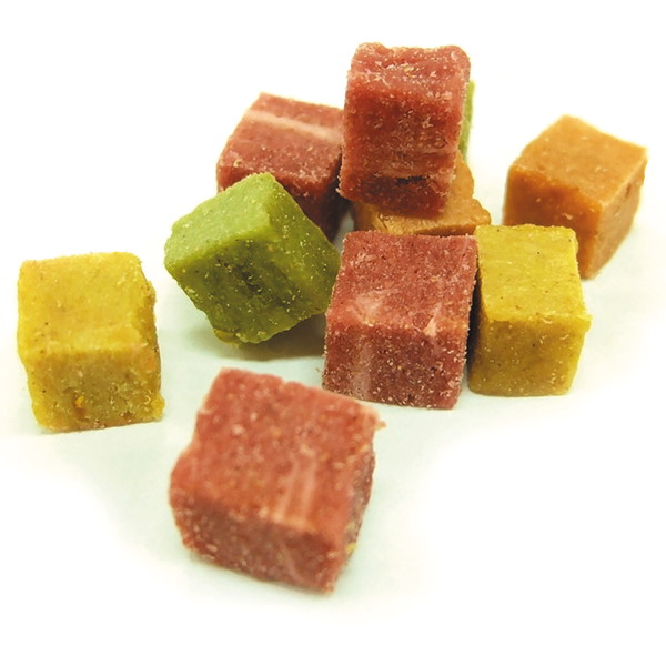 小麦粉、鶏ささみ、鶏肉、脱脂大豆、糖類、じゃがいもでん粉、小麦グルテン、バターミルクパウダー、牛脂、野菜(かぼちゃ、にんじん、キャベツ、ほうれん草)、ビーフパウダー、フィッシュパウダー、プロピレングリコール、ソルビトール、ミネラル・ビタミン類、リン酸塩(Na)、保存料(ソルビン酸K、デヒドロ酢酸Na)、食塩、酸化防止剤(エリソルビン酸Na)、着色料(酸化チタン、黄4、黄5、赤2、赤102、赤106、青1)
