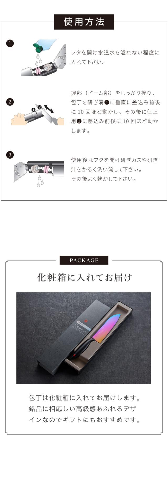 シャープナー:包丁をセットし10回程手前に引くだけで簡単に刃付けができます。※両刃包丁専用