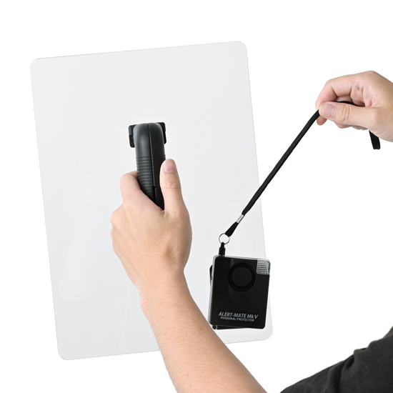 ※写真のアラーム(アラートメイトMK5)はオプション品です。アラートメイトMK5には壁掛けホルダーが付属しています。シールドの好みの位置に取り付けることが可能です。