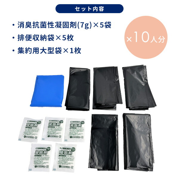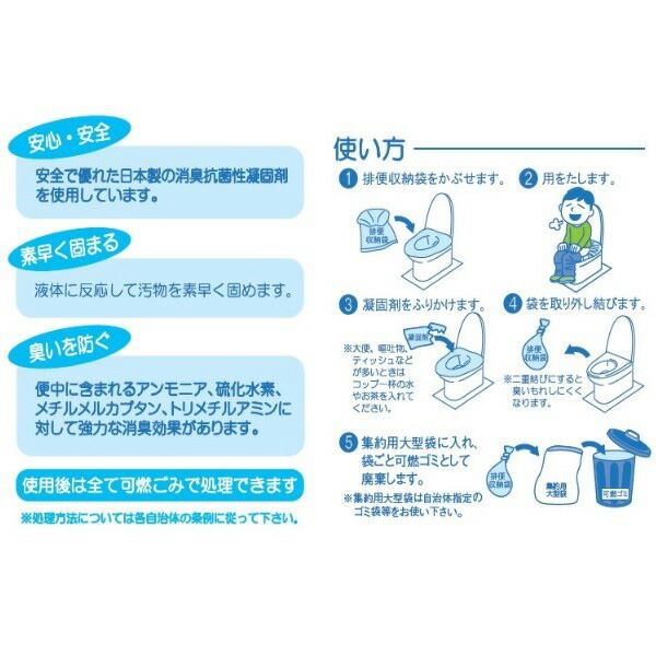 | 商品説明 | ●1日必要なトイレの数量5回×10人分が入っている非常用配れるトイレ ●地震等の災害時による断水、介護やドライブ中の渋滞、アウトドアなど様々な緊急時の排泄問題を解消するために開発された、水がなくても使える簡易トイレ ●安全で優れた日本製の消臭抗菌性凝固剤を使用しています ●液体に反応して汚物を素早く固めます ●便中に含まれるアンモニア、硫化水素、メチルメルカプタン、トリメチルアミンに対して強力な消臭効果があります ●使用後は全て可燃ごみとして処理できます ※処理方法については各自治体の条例に従ってください ●使い方 1.排便収納袋をトイレの便座にかぶせます 2.用をたします 3.凝固剤をふりかけます ※大便、嘔吐物、ティッシュなどが多いときはコップ1杯の水などを入れてください 4.袋を取り外し結びます ※二重結びにすると臭いもれしにくくなります 5.集約用大型袋に入れ、袋ごと可燃ごみとして廃棄します ※集約用大型袋は自治体指定のごみ袋等をお使いください ●便座にぴったりサイズ ●10年保存 ●セット内容:【消臭抗菌性凝固剤(7g)×5袋、排便収納袋×5枚、集約用大型袋×1枚】を10人分 |