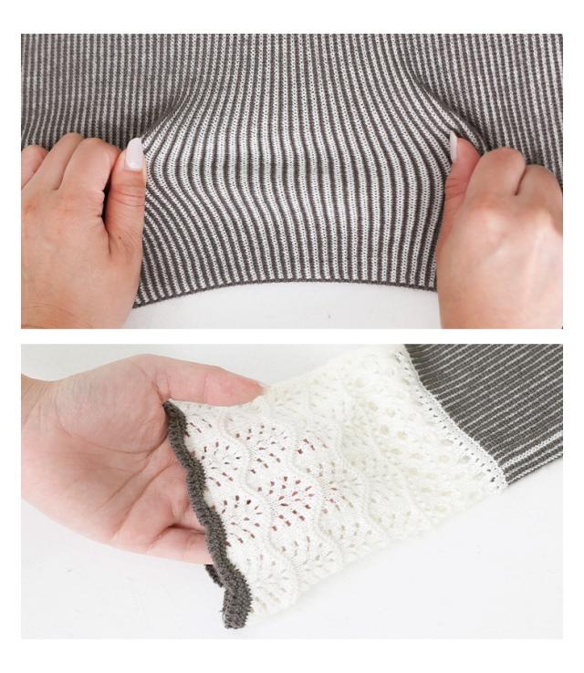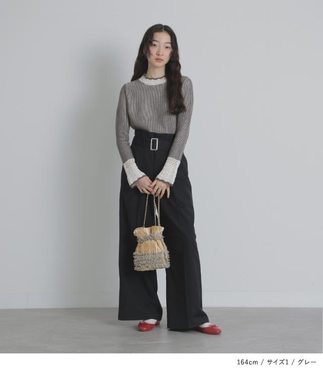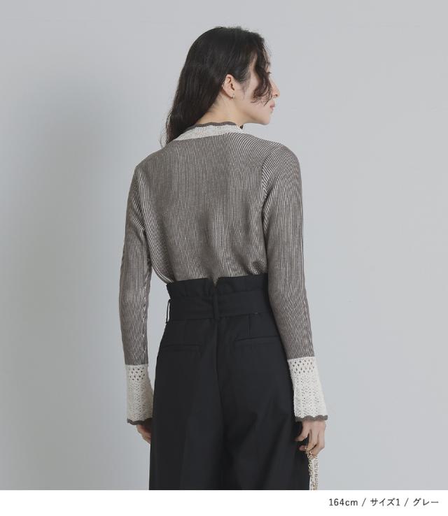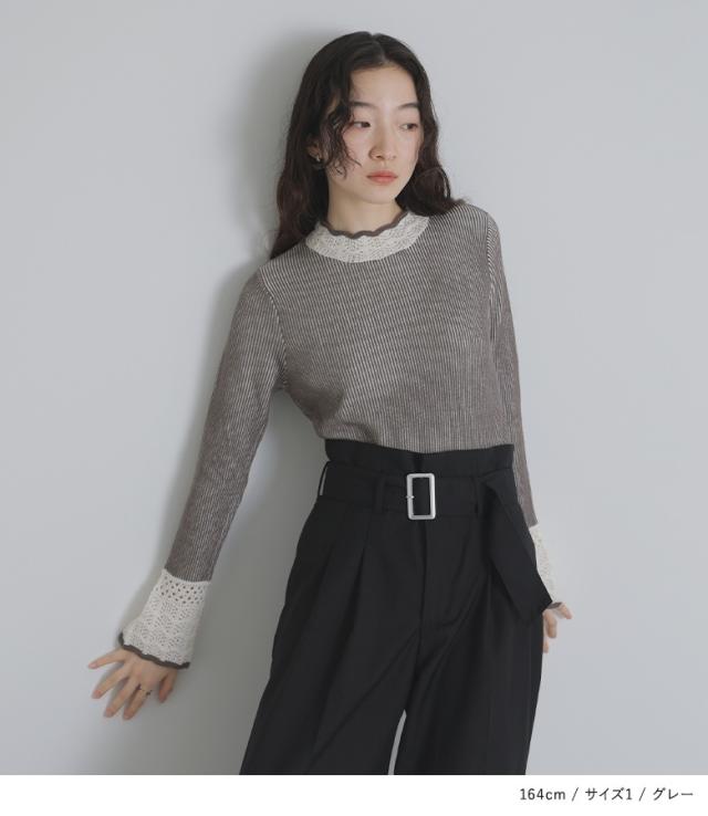 ■デザイン 配色の両畦編みにすることで編地がストライプのように見えるニット。襟と袖カフスはレース編みにすることでロマンティックな要素をプラスしました。 ■コーディネート 程良いサイズ感で、一枚でもレイヤードアイテムとしても着回せます。ボトムスにインしてもすっきりとご着用いただけます。 ■素材 肌触りの良い、さらっとしたアクリルコットンの糸を使用。伸縮性があり快適な着心地です。 ニット製品につきまして。 ニット素材の持つ特性として編み上げる行程やプレス仕上げによって多少サイズや風合いの個体差が生じる場合がございます。 着用した時と実寸の長さが変わる可能性がございます。 また、着用の際ピリングが避けられず、完全に防止することはできません。毛玉取り器等で丁寧に取り除いてください。 ご了承の上、ご購入いただきますようお願いいたします。 |