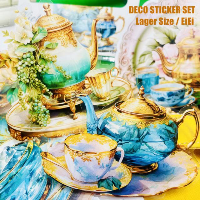 クリアシール 大きめ 華やか 水彩 コラージュ 素材 シール 21枚 20枚 洋風 ティーカップ イラストシール PET 耐水 ステッカー 1枚 両面印刷 背景ペーパー おしゃれ デコレーション 花柄 ローズ 薔薇 植物 食器 洋食器 ゴールドライン ハンドメイド 手帳 日記 DIY