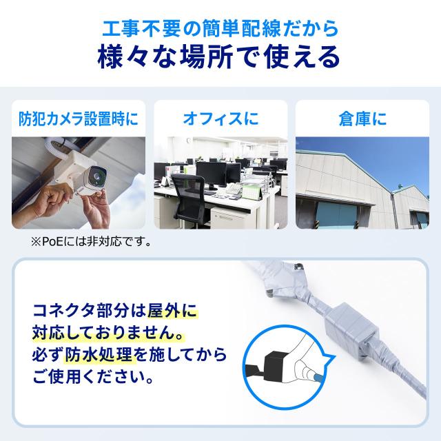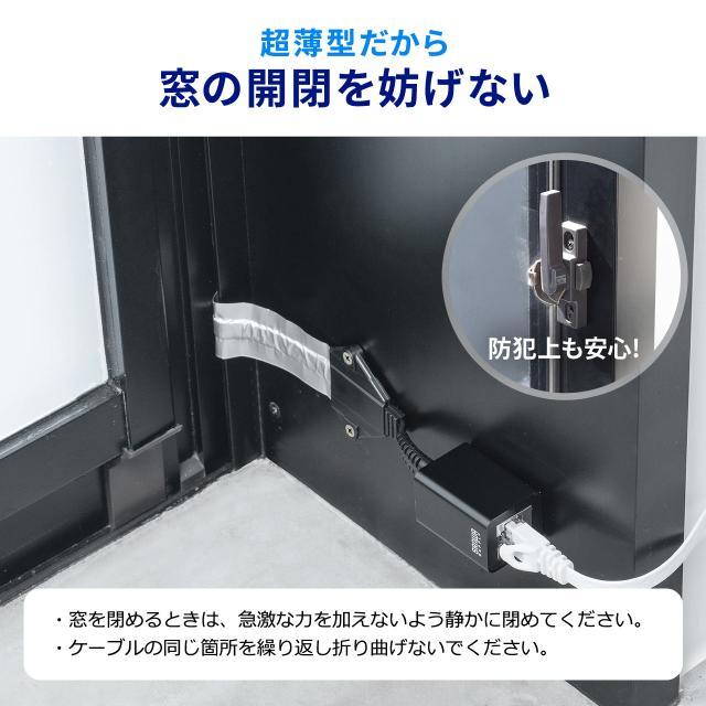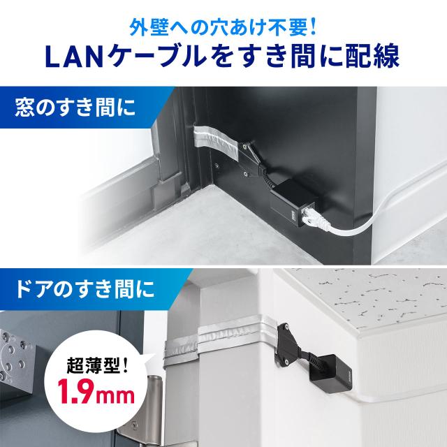 ●屋外から屋内へLANケーブルを引き込める、すきま用LANケーブルです。●窓の隙間やドアのすき間を利用するので、壁に穴を開けずにLANケーブルを引き込めます。