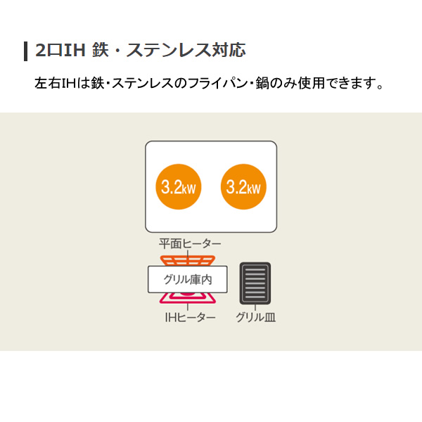 左右IHは鉄・ステンレスのフライパン・鍋のみ使用できます。