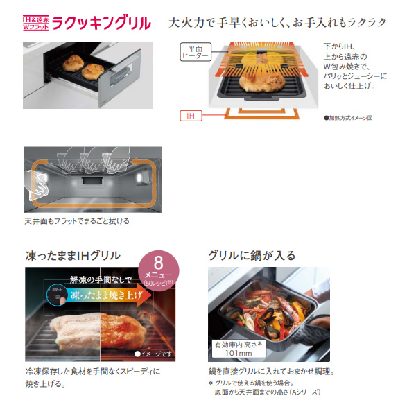 またIHと平面ヒーターでフラットな庫内を実現。焼き網のないグリル皿でお手入れラクラク。