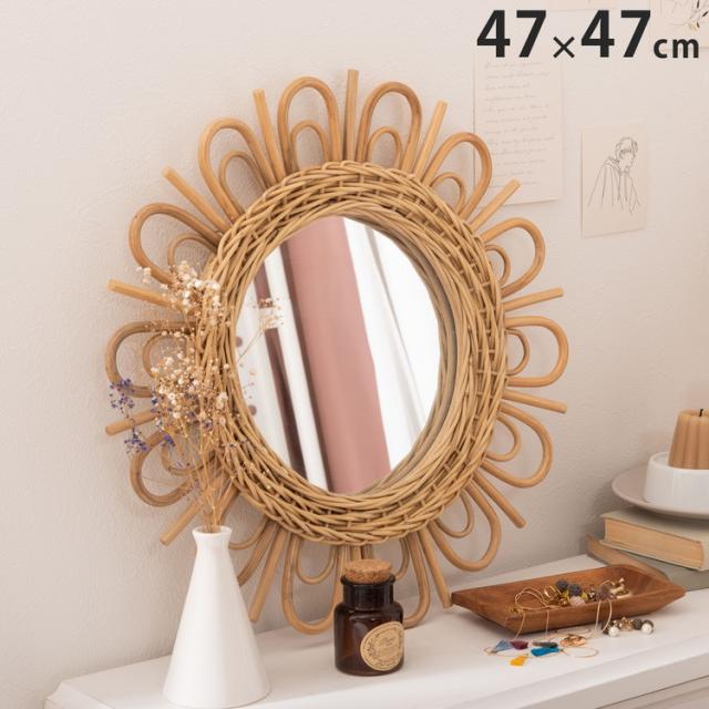 ラタンミラー ミラー 鏡 姿見 壁掛け ウォールミラー スタンド 丸型 円型 ラタン 籐 シンプル おしゃれ ナチュラル インテリア 省スペース 新生活 一人暮らし(代引不可)【送料無料】