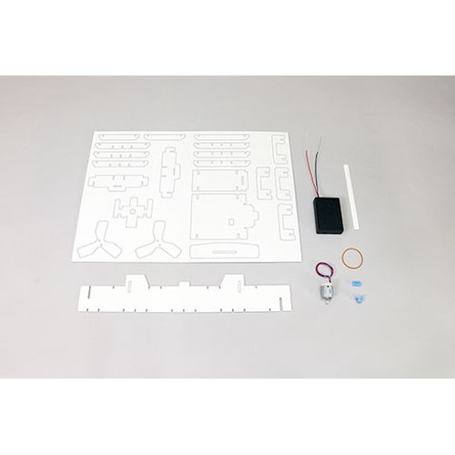 モーター×1、輪ゴム×1、プロペラ固定パーツ×1、両面テープ×1、電池ボックス×1、台紙セット×1