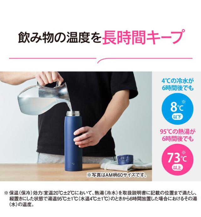※ 保温(保冷)効力とは、室温20℃±2℃において製品に熱湯(冷水)を取扱説明書に記載の位置まで満たし、ふたをつけて縦置きにした状態で湯温が95℃±1℃(水温が4℃±1℃)の時から6時間放置した場合におけるその湯(水)の温度。