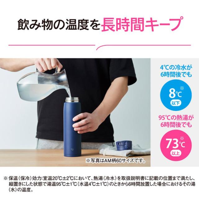 ※ 保温(保冷)効力とは、室温20℃±2℃において製品に熱湯(冷水)を取扱説明書に記載の位置まで満たし、ふたをつけて縦置きにした状態で湯温が95℃±1℃(水温が4℃±1℃)の時から6時間放置した場合におけるその湯(水)の温度。