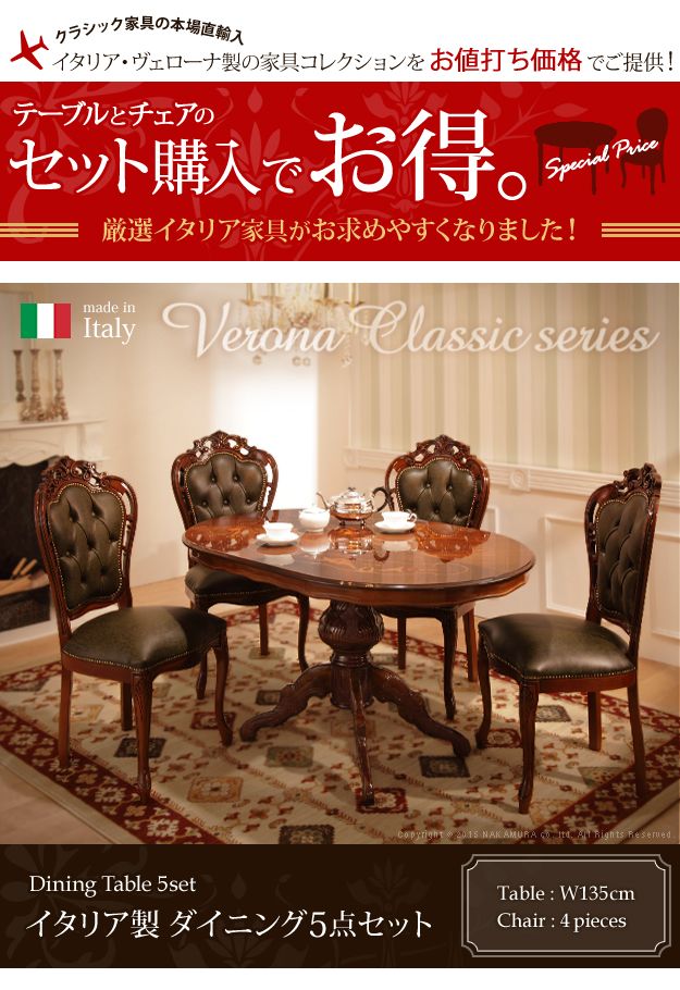イタリア製 ヴェローナ クラシック ダイニング 5点セット 五点セット ダイニングテーブル 幅135 革張り ダイニングチェア 四脚 おしゃれ(代引不可)【送料無料】