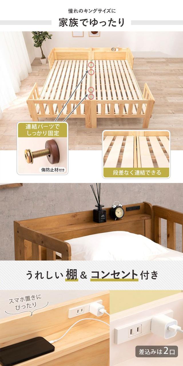 キングサイズベッド 連結できるシングルベッド×2台セット 敷布団用サイズ コンセント 棚付き ファミリーベッド キング 耐荷重200kg 天然木 ベッドガード ベッドフレーム(代引不可)【送料無料】