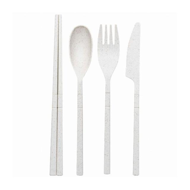 12.5×5.5×2.2cmケース1個・全長17.4cmスプーン・全長17.4cmフォーク・全長17.9cmナイフ各1本・全長18.7cm箸1膳・ポリプロピレン、小麦わら・[中国製]
