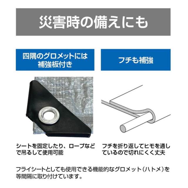 四隅のグロメットには補強版付き。シートを固定したり、ロープなどを吊るして使用可能。