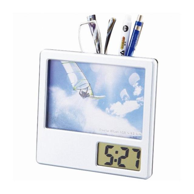 123×95mmの写真が入れられる時計付ペンスタンドです。背面のペンスタンドは折りたたみ可能で、壁掛けとしても使えるユニークな構造になっています。機能:時計、カレンダー、フォトフレーム、ペンスタンド機能付。