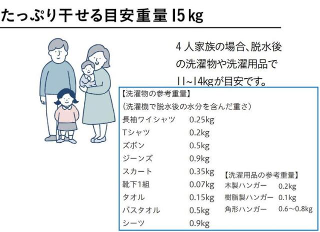 4人家族の場合、脱水後の洗濯物や洗濯用品で11〜14kgが目安です。