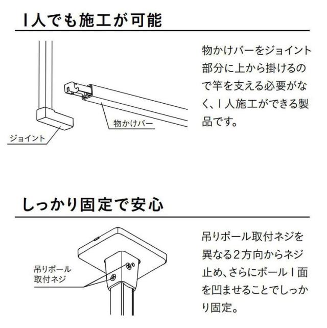 物かけバーをジョイント部分に上から掛けるので竿を支える必要がなく、1人で施工ができる製品です。