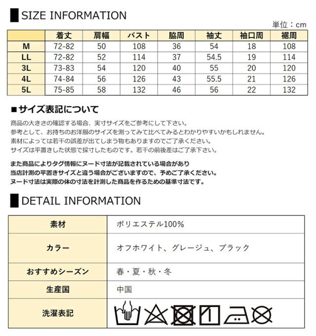 5L:着丈75-85 肩幅58 バスト132 脇周46 袖丈56 袖口周22 裾周132