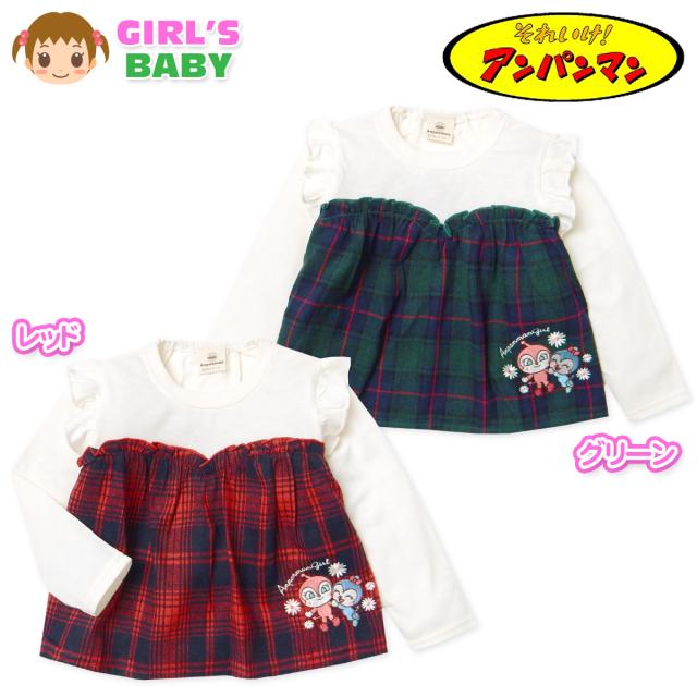 【送料無料】女児 ベビー 重ね着風 長袖 Tシャツ アンパンマン ドキンちゃん 刺繍ワッペン チェック柄ビエラ 天竺 ベビー服 女の子 80cm 90cm 95cm iw-1170【メール便対応】