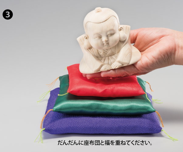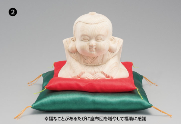 商売繁盛、開運招福、健康長寿の願いを込めて!だんだんと福を招く福助人形。ご存じの方も多い福助は、裃(かみしも)を着て、正座でお辞儀をした礼儀正しいお姿で、江戸時代より福を招く縁起物として愛されてきました。今回ご紹介の福助人形は、段々に重なった座布団に鎮座する、ちょっと珍しい木彫りの福助です。重ねた座布団を幸福なことがあるだびに福助に感謝し、座布団を増やしてあげると、さらに幸せを呼び、だんだん大きな福を招くといわれています。材は木目の美しい檜を用いた一木彫り。檜は神社仏閣の建材にも利用される聖木、神木とされ、暑さ寒さに耐え、寿命が長い木が多いことからも大変縁起が良いといわれています。「だんだん福助」には、3色の大きさの違う座布団が付属しています。はじめは赤い座布団一枚から、飾る人の願いが叶う度、幸福な事がある度に「だんだん」と座布団を重ねて福助に感謝する為です。【サイズ(約)】本体:高さ9×幅10×奥行6.5cm【材質】檜(ヒノキ)【付属品】座布団3枚付属