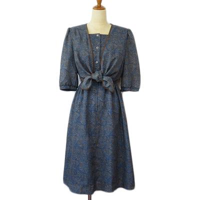 【中古】FEMICBAFT レトロ ヴィンテージ 日本製 ワンピース 総柄 五分袖 シフォン 9 青 ブルー レディース
