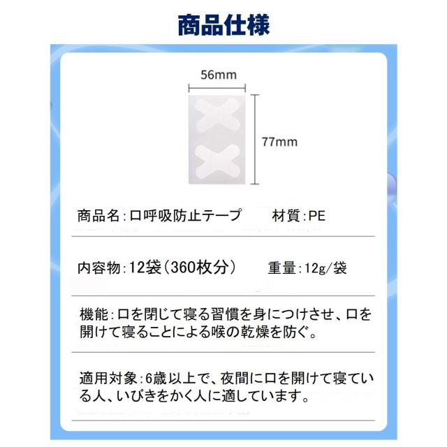 口呼吸 防止 テープ 360枚入 鼻呼吸 口閉じ マウステープ 矯正 改善 通気性 蒸れない 跡残りなし 睡眠 いびき 乾燥 寝言 よだれ 軽減 対策 子供 大人 男女 対応