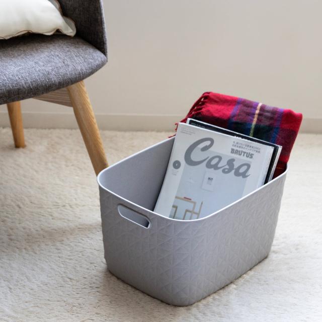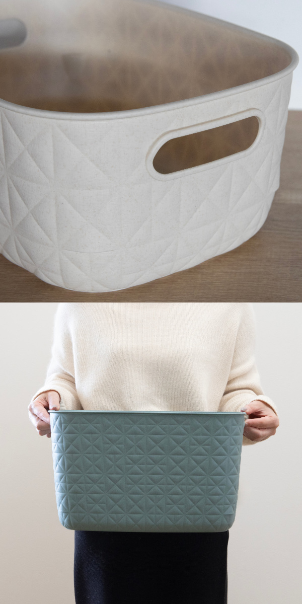 心地よい感触とやわらかな質感が特徴のキルト調バスケットです。三角形と四角い格子を組み合わせた表面の凹凸が、キルト生地のような独特のふっくらとしたやわらかな質感を生み出します。