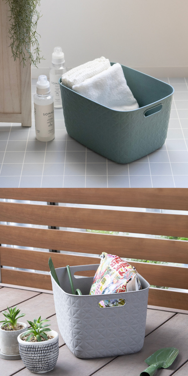 水や湿気に強く多湿な空間でも活躍します。ランドリースペースのタオルや小物入れ、ガーデニング用品の収納、観葉植物カバーにもぴったりです。