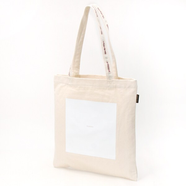 マチのないスッキリとしたスクエアー型に四角いプリントとくり抜かれたロゴがさり気なく可愛いデザイン。