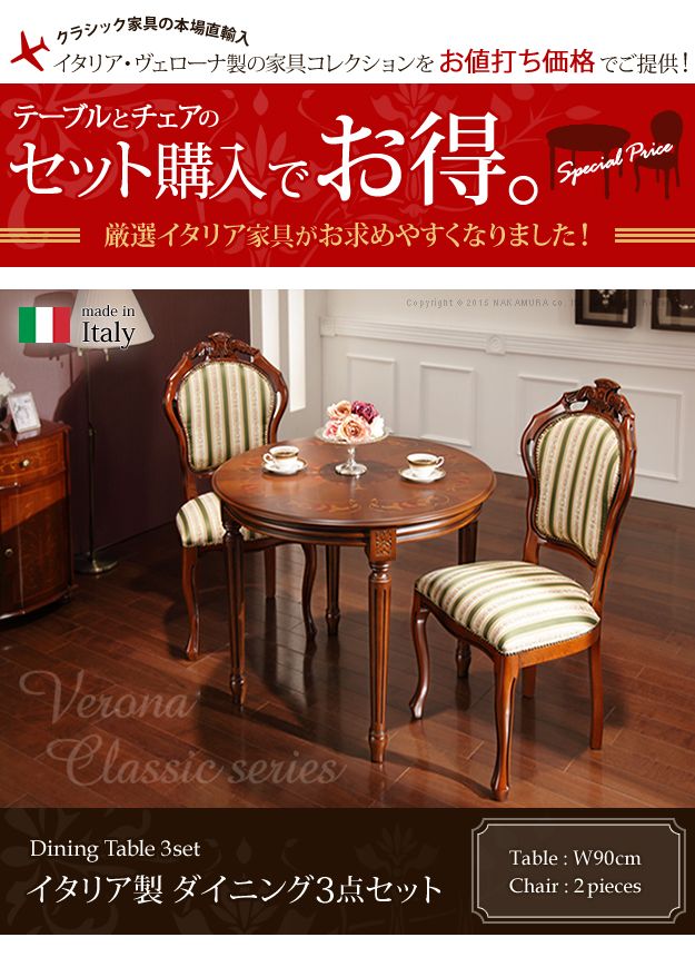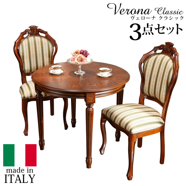イタリア製 ヴェローナ クラシック ダイニング 三点セット 3点セット ダイニングテーブル 幅90 ストライプ チェア 二脚 おしゃれ アンティーク(代引不可)【送料無料】