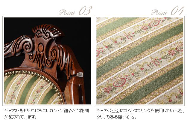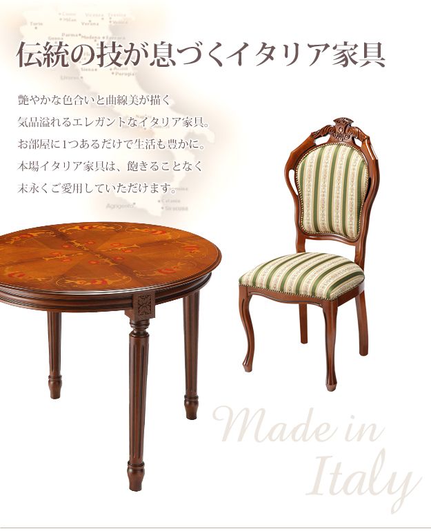 商品について:イタリア伝統の美しい象嵌細工が施された直輸入のダイニングテーブルセットです。艶やかな色合いと滑らかな曲線を描くフォルムがお部屋をエレガントに演出。チェアはフレームに施された彫刻と美しい猫脚が魅力的です。