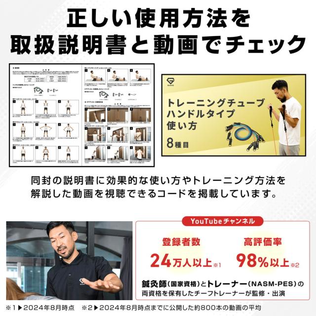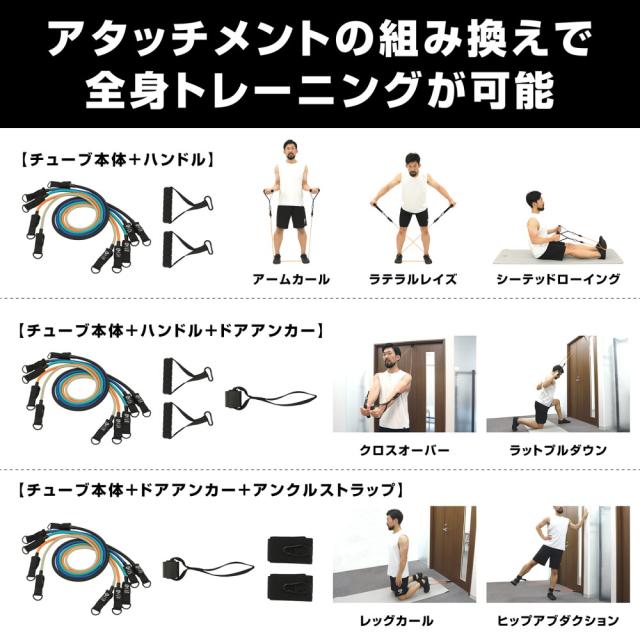 自宅で手軽に全身トレーニングができる「トレーニングチューブ ハンドルタイプ 強度別5本セット」です。