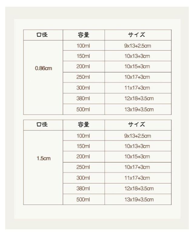 | サイズ | 口径0.86cm*100ml 口径0.86cm*150ml 口径0.86cm*200ml 口径0.86cm*250ml 口径0.86cm*300ml 口径0.86cm*380ml 口径0.86cm*500ml 口径1.5cm*100ml 口径1.5cm*150ml 口径1.5cm*200ml 口径1.5cm*250ml 口径1.5cm*300ml 口径1.5cm*380ml 口径1.5cm*500ml |