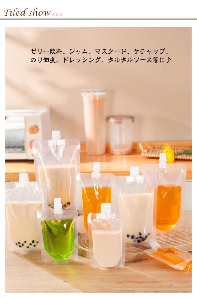 100個セット スパウトパウチ 透明 100ml 150ml 200ml 250ml 300ml 380ml 500ml ドリンク パウチ パック 大口 保存容器 容器 詰め替え ジュースパック 飲み物用 ふた付 持ち運び便利 自立 スパウトパウチスタンド袋 ドレッシング 漏斗付き 計量カップ付き