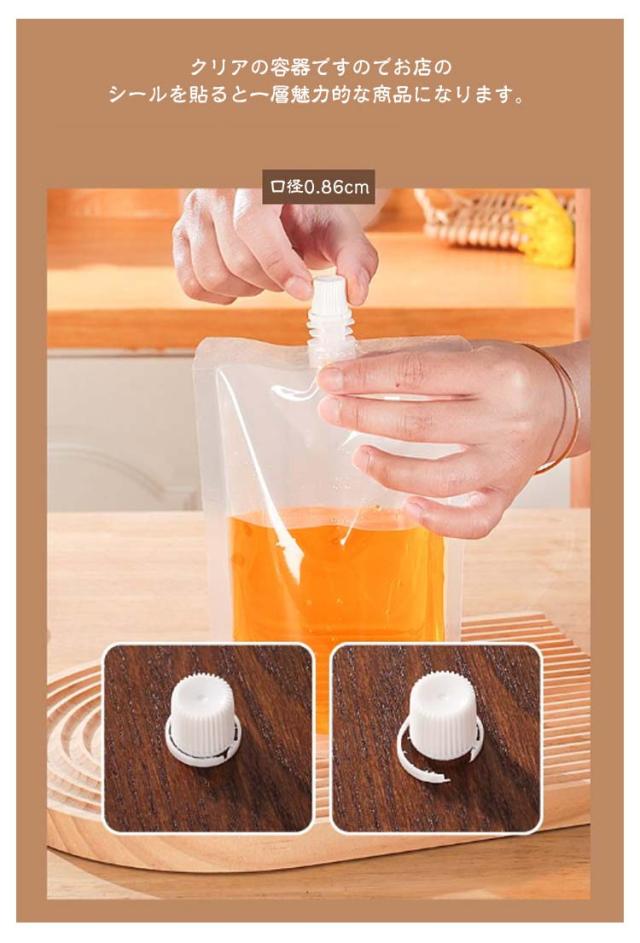 | 飲み口広々!スパウトパウチの容器100個セットです。 開封した事が分かるバージンキャップ付き♪ 温&冷OK沸騰した100度のお湯で湯煎できます。 冷凍庫保存ok!!-40度にも耐えれます。 クリアの容器ですのでお店のシールを貼ると一層魅力的な商品になります。 また既製品の未開封ペットボトルのキャップの様になるので安心して購入していただけます。 ペットボトルと違って走っているときに揺れたり音がすることがないです。 減った分はコンパクトにたたむ事が出来ます!! ボトルに比べて小さく折りたたんで廃棄でき、ゴミの減容化が可能、環境配慮型パッケージです。 ゼリー飲料、ジャム、マスタード、ケチャップ、のり佃煮、ドレッシング、タルタルソース等に♪ 注む用具が付き、液体を簡単に注入できます。 キャップでしっかり密封すると漏れる心配がないんです。 旅行などにドリンクを携帯するのにも便利! | |