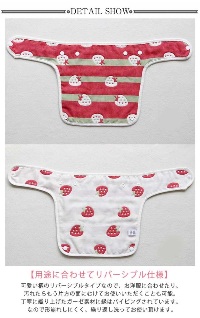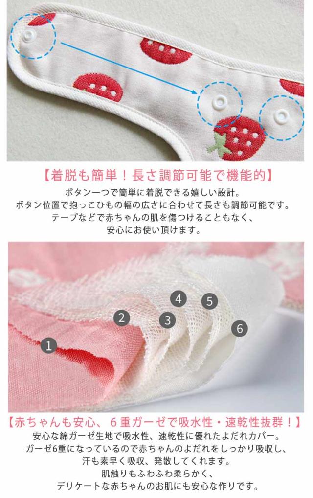 | 【赤ちゃんも安心、6重ガーゼで吸水性・速乾性抜群!】 安心な綿ガーゼ生地で吸水性、速乾性に優れたよだれカバー。ガーゼ6重になっているので赤ちゃんのよだれをしっかり吸収し、汗も素早く吸収、発散してくれます。肌触りもふわふわ柔らかく、デリケートな赤ちゃんのお肌にも安心な作りです。 【便利な3点セット】 胸カバー&ベルトの3点セット!赤ちゃんの肌が直接洋服に触れないよだれパッド。ボタンなどのディティールで赤ちゃんの肌を守ります。前向き抱っこの時は抱っこひもに装着しても◎抱っこひもの汚れを防ぐことができます。また、洗濯も可能なので清潔な状態を保つことができます。 【用途に合わせてリバーシブル仕様】 可愛い柄のリバーシブルタイプなので、お洋服に合わせたり、汚れたらもう片方の面にむけてお使いいただくことも可能。丁寧に織り上げたガーゼ素材に縁はパイピングされています。なので形崩れしにくく、繰り返し洗ってお使い頂けます。 【着脱も簡単!長さ調節可能で機能的】 ボタン一つで簡単に着脱できる嬉しい設計。ボタン位置で抱っこひもの幅の広さに合わせて長さも調節可能です。テープなどで赤ちゃんの肌を傷つけることもなく、安心にお使い頂けます。 【様々なシーンで大活躍!】ボタンで簡単に着脱できるので、抱っこひも用だけでなく、ベビーカー、チャイルドシートなどにもお使い頂けます。使い方次第で幅が広がる便利なアイテムです。 | |
