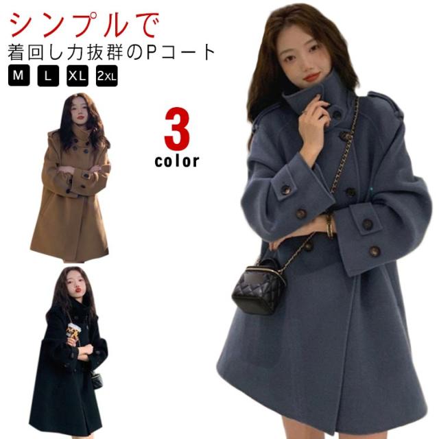 Pコート スタンドカラー おしゃれ 2way ステンカラーコート ウールライク 防寒 レディース 上着 保温 アウター 暖かい Pコート ハイネック 低身長 カジュアル きれいめ 上品 ミドル丈 可愛い 通勤 体型カバー
