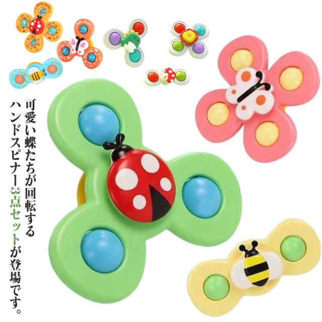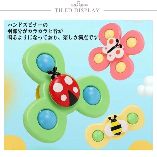 | 可愛い蝶たちが回転するハンドスピナー3点セットが登場です。 吸盤付きで凹凸のないテーブルや壁、浴室などにくっつけて子供の好奇心を刺激し集中力を養います。 ハンドスピナーの羽部分がカラカラと音が鳴るようになっており、楽しさ満点です。 | |