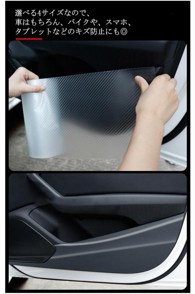 | 車の乗り降りの傷防止に最適!カーボン調の透明スカッフプレートシール。 上品に見えるカーボン調でサイドシル、バンパー、サイドミラーなどのキズ防止に大活躍。 透明なのでどんなカラーの車にも合わせやすく、違和感なくご利用いただけます。 ハサミでお好きなサイズにカットできますので、外装・内装などあらゆる場所に取り付けできます。 貼り付けるだけで傷防止に◎ 選べる4サイズなので、車はもちろん、バイクや、スマホ、タブレットなどのキズ防止にも◎ | |