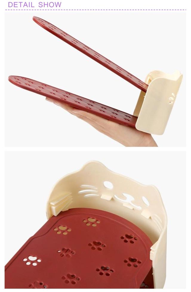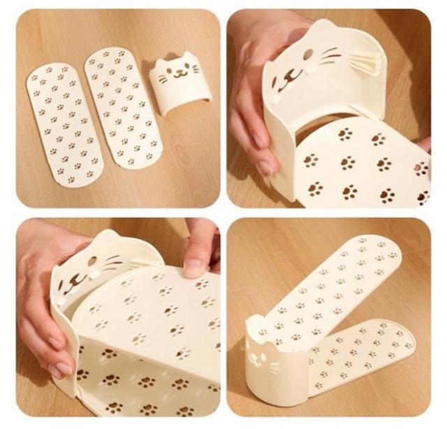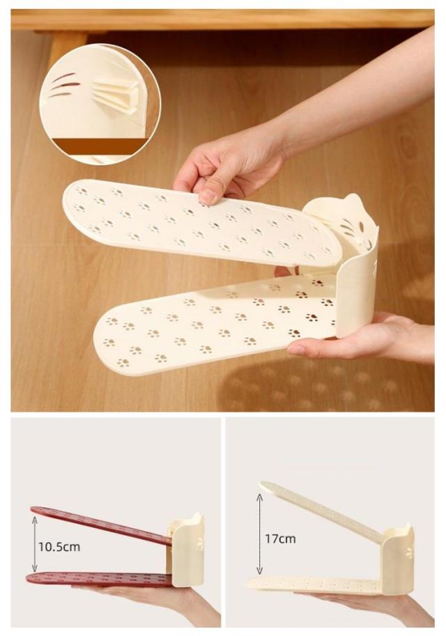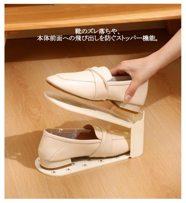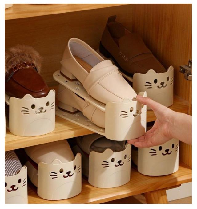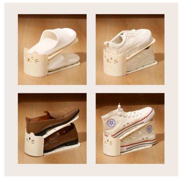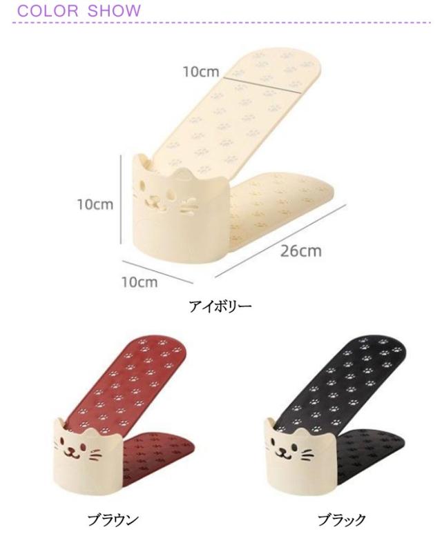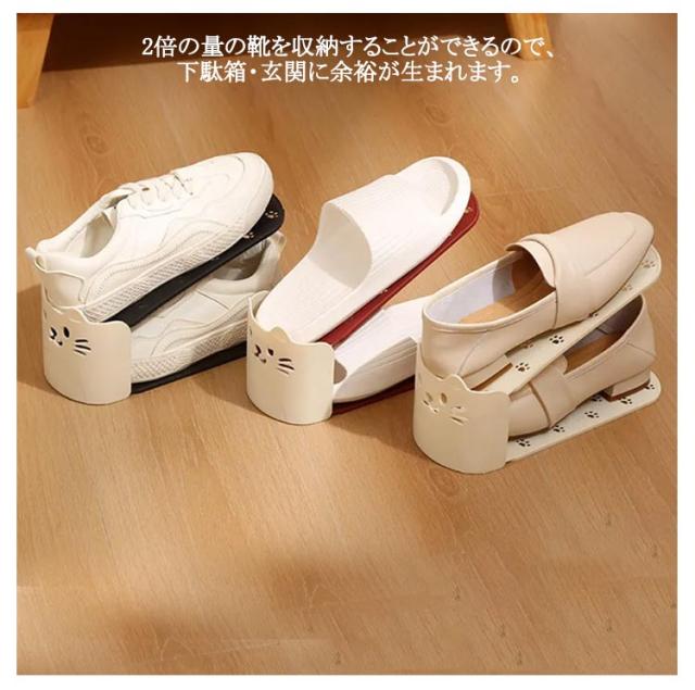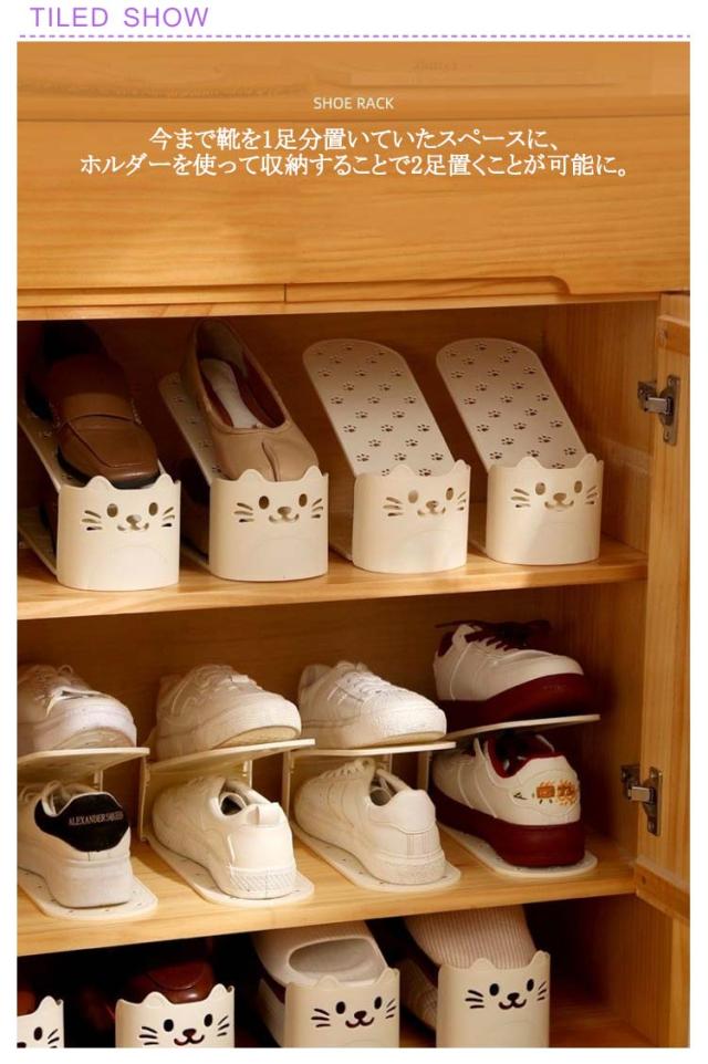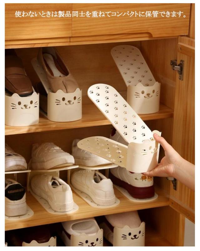 | かわいい猫型!省スペース有効活用靴スタンド。 今まで靴を1足分置いていたスペースに、ホルダーを使って収納することで2足置くことが可能に。 2倍の量の靴を収納することができるので、下駄箱・玄関に余裕が生まれます。 靴のズレ落ちや、本体前面への飛び出しを防ぐストッパー機能。 使わないときは製品同士を重ねてコンパクトに保管できます。 | |
