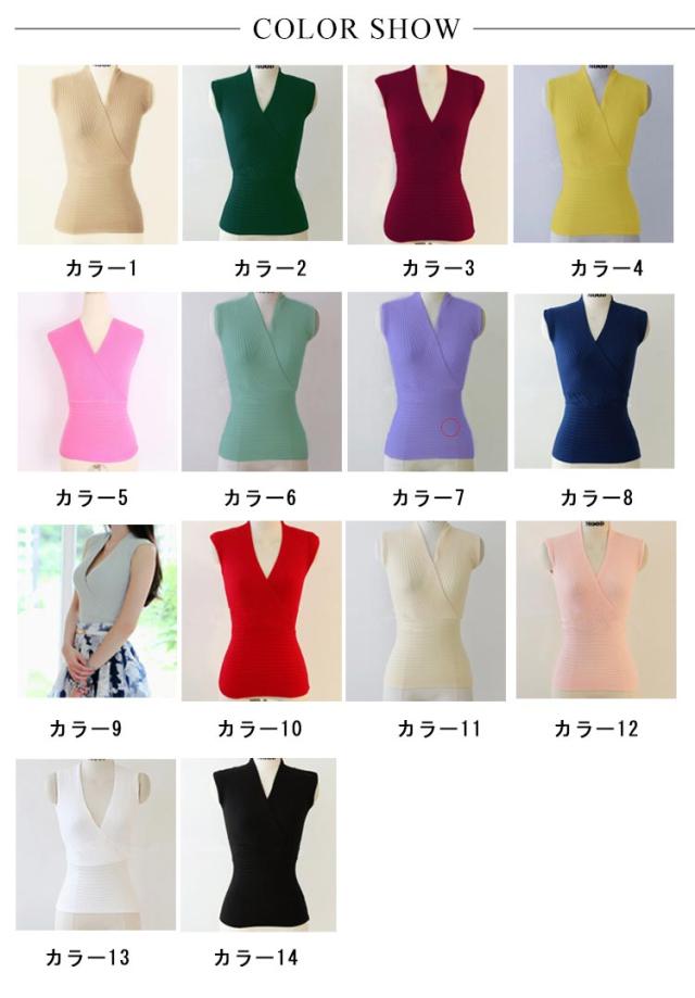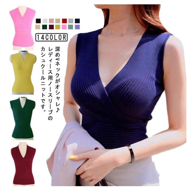 全14色!ノースリーブ カシュクール ニット 深いVネック リブニット ノースリーブ カシュクール スリム セクシー レディース 薄手ニット サマーニットリブ編み 着痩せ 胸元 ショート丈 ダンス 全14色!ノースリーブ 細見え