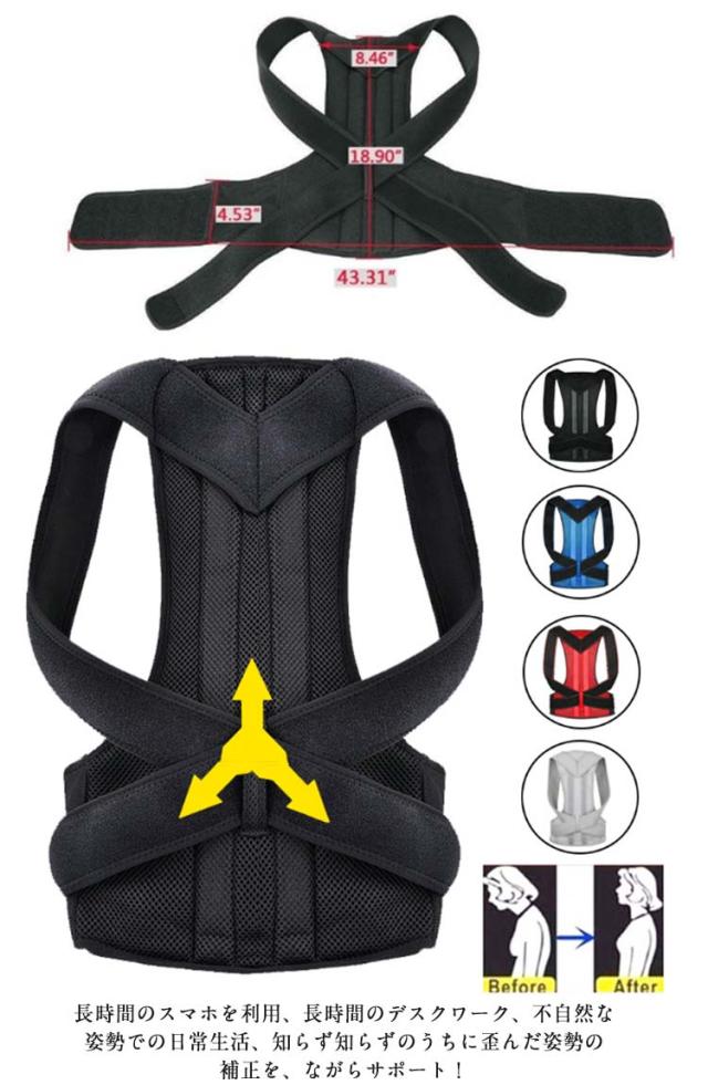 | 丁寧な縫い目と耐久性高いの素材、変形しないて猫背サポーター。 初めて使用して、姿勢を変えることで不快感がある場合がありますので、短時間で何度も使用できて、徐々に慣れるようになります。 長時間のスマホを利用、長時間のデスクワーク、不自然な姿勢での日常生活、知らず知らずのうちに歪んだ姿勢の補正を、ながらサポート! 正しい姿勢は、身長を高く見せるだけでなくお腹をスッキリ見せれます。 体を矯正するために、普段は器具で姿勢を矯正して、背中の筋肉を鍛えると同時に、寝姿を注意してください。 通気性抜群!快適なメッシュ素材で蒸れることなく、一年中快適に着用できます。 2本のボーンがしっかり肩甲骨を引き寄せ正しい姿勢へと導きます。腰を支え、猫背を補正することで本当の良い姿勢を実現します。 幅広のベルトが腰への負担を分散することができ、正しい姿勢を体に覚えさせることで、ストレスを感じなく自然と身に付きます。 マジックテープで調整が容易で、男女、体型や好みの諦め加減に合わせて自由に調整していただけます。 | |