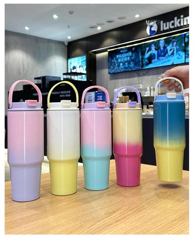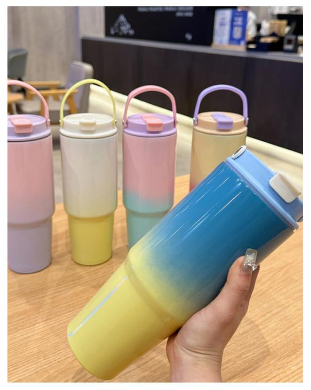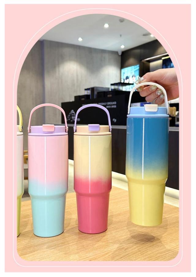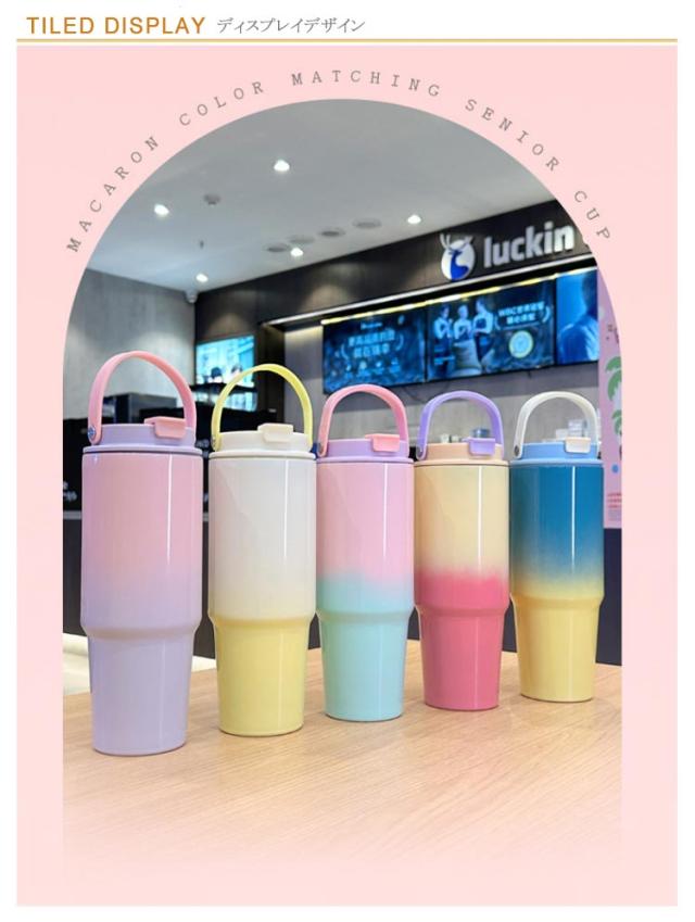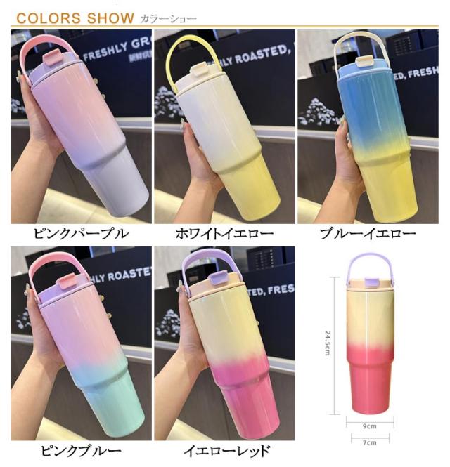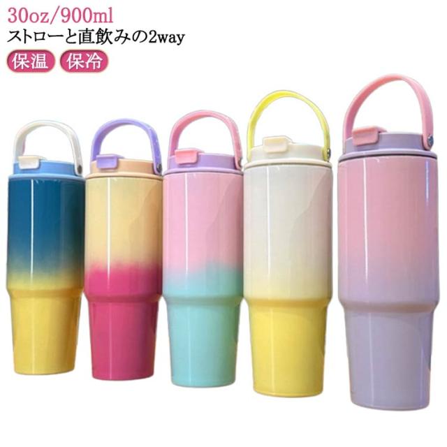 ハンドル 保冷 ストロー ストロー付き 保温 おしゃれ マグボトル 水筒 ステンレス タンブラー ストロー付き可愛い オシャレ グラデーション 30oz/900ml 蓋付き 真空 タンブラー 持ち運び 取っ手 こぼれない 直飲み ウォーターボトル