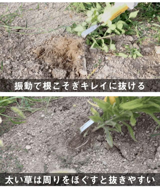 この除草バイブレーターミニの一番の特徴 は、振動で雑草を震わせて雑草を根っこごと、『根こそぎ抜き去る』ことにより、草が生えづらい事です。