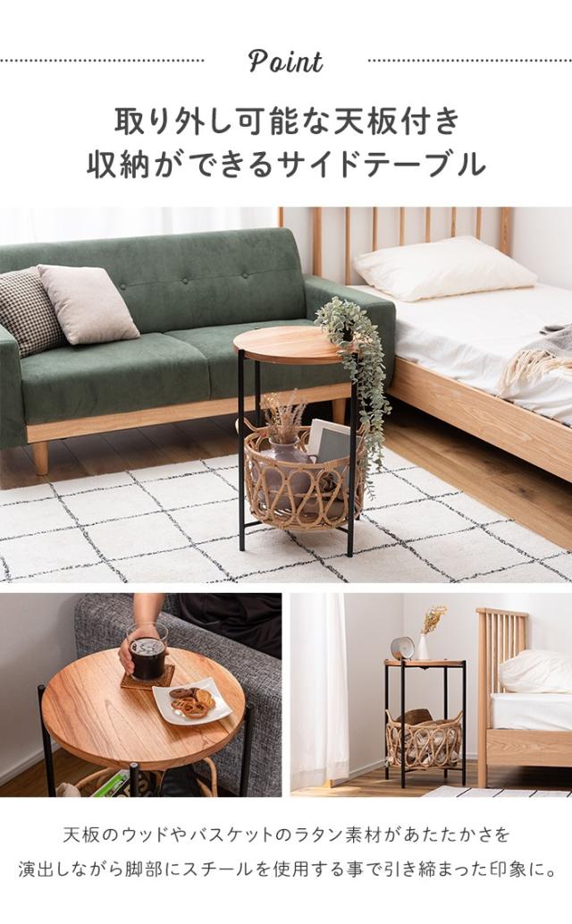 | 取り外し可能な天板が付いた、収納ができるラウンドテーブル 高さ60cmと、サイドテーブルとして最適な設計です。 ソファ横やベッド脇など、様々な場所で活躍してくれます。 スチール×ウッドの異素材MIX。 天板のウッドやバスケットのラタン素材があたたかさを演出しながら脚部にスチールを使用する事で引き締まった印象に。 |
